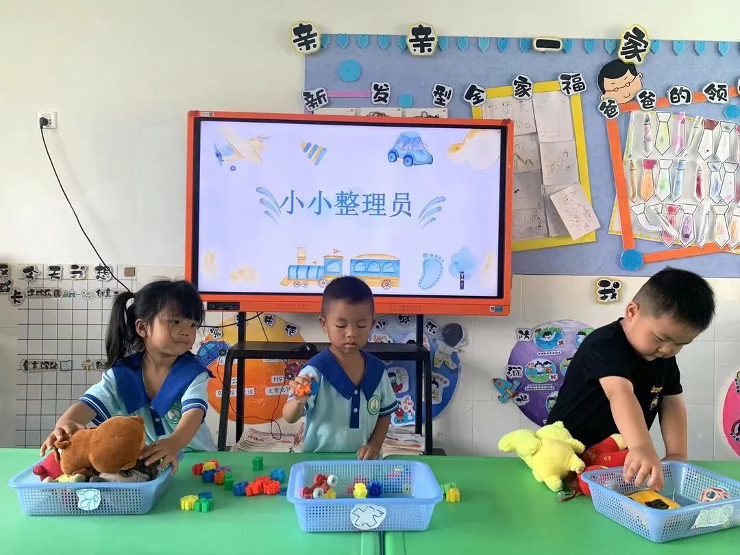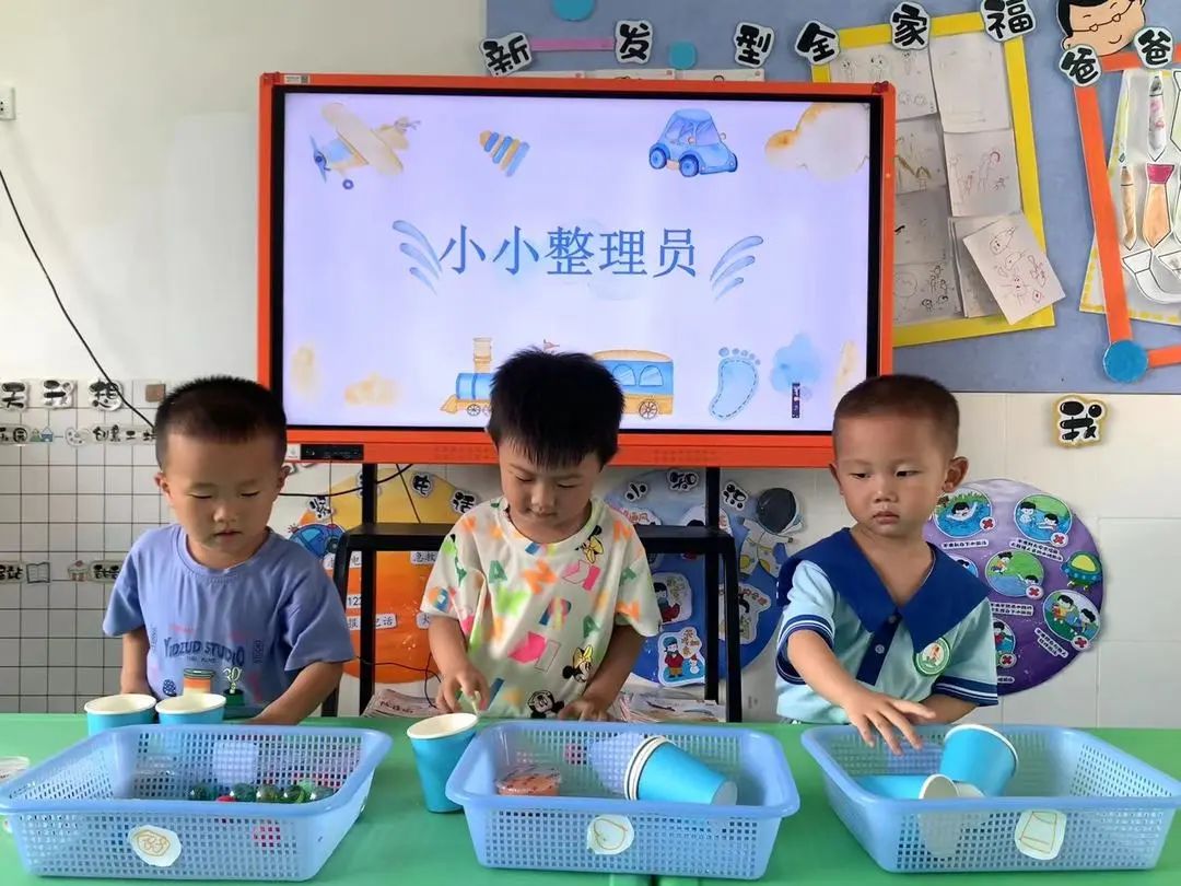 孩子们通过整理玩具,懂得要爱护玩具,并学会了按图形、颜色、数数、对应、配对的一些初浅的数学经验。