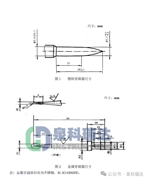 取装液本品数个, 先用符合上面标有图 1和图2的穿刺器穿刺输液瓶上的穿刺部位,然后将容器与穿刺器置 两个平行平板之间, 施加20kPa 内压,维持15秒, 穿剌部 位不得有液体泄漏;压力试验完成后,从穿刺部位以200mm±50mm/ min的速度拔下穿刺器, 塑料穿刺器分离力不得 5.0N ,金属穿刺器分离力不得低1.0N 。拔出穿刺器后再将容器 置于两个平行平板之间,施加 20kPa内压 ,维持15秒, 穿刺部位不得有液体泄漏。