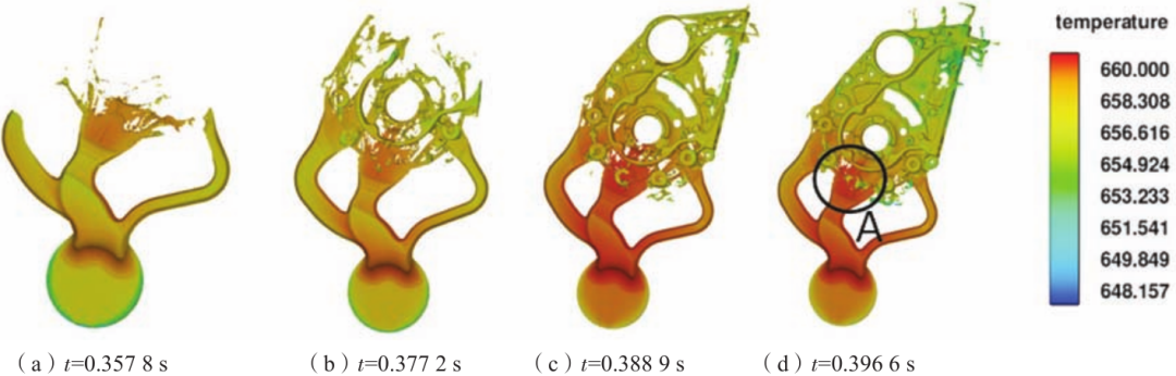 充型过程数值模拟结果如图4所示。从图中可以看出,t=0.3578s时刻,金属液首先从中间的内浇道进入型腔;t=0.3578s时刻,3个横浇道的金属液在中心汇流;t=0.3889s时刻,整个型腔的轮廓大部分填充完毕;t=0.3966s时刻,整个铸件基本充填完毕。从金属液进入内浇道开始到填充完成,产品填充全程时间为0.0388s。从图4d可以看出,A区域标记的悬置孔未完成充填,此时该区域周围已经被金属液包围,卷入该处的气体将难以排出,需要对浇注系统进行优化。