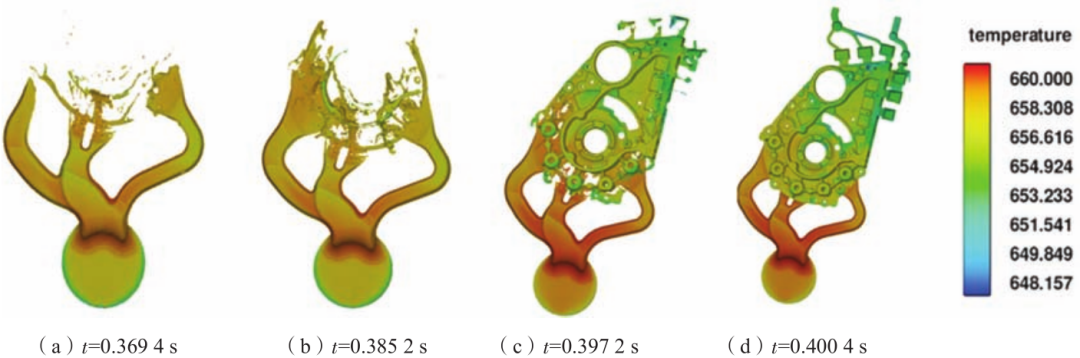 浇注系统优化后铸件充型过程数值模拟结果如图6所示,由图可见,t=0.3694s时刻,金属液通过内浇道开始充填型腔;t=0.3852s时刻,开始充填中心轴承孔位置,金属液流动平稳;t=0.3927s时刻,首先进入型腔的金属液进入溢流槽,将夹杂的气体与氧化物带入溢流槽,此时压铸件基本充填完毕,与初始工艺相比,有缺陷的悬置孔区域充型状况良好;t=0.4004s时刻充型完毕,充型过程时长约为0.031s,金属液充填顺序良好,铸件轮廓清晰。