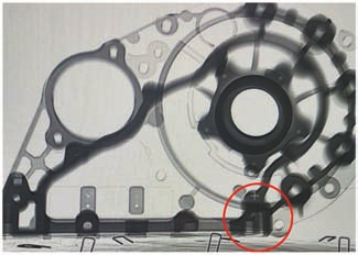 根据优化工艺设计制备模具并进行试产,铝合金材料选择ADC12,压铸机为DCC800T卧室冷室压铸机,压铸过程中对模具型腔抽真空,以减少铝液流动过程夹杂和气体卷入量,提高填充质量。经X射线无损探伤检测发现,产品部分位置存在较多缩松,如图7所示。分析该缺陷产生的原因是此处壁厚尺寸较大,凝固较晚,中心热节补缩不足。综合考虑模具结构与生产实际情况,确定采用局部挤压工艺进行优化。