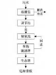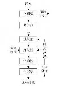 一种常规生化处理后增加生态塘处理工艺。生态塘亦称氧化塘或稳定塘,是一种利用天然净化能力对污水进行处理的构筑物的总称。其净化过程与自然水体的自净过程相似,通常是将土地进行适当的人工修整,建成池塘,并设置围堤和防渗层,依靠塘内生长的微生物来处理污水。