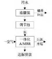 该技术适用于有回用要求或用地紧张的的污水处理设施,处理规模20 ~500 吨/天。工艺参数:缺氧反应区停留时间不小于2 h,MBR区停留时间不小于4 h,污泥理周期360 天,工艺流程见图11。