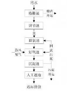处理规模不小于200 吨/天。工艺参数:厌氧池停留时间不小于2 h,缺氧池停留时间不小于4 h,好氧池停留时间不小于6 h,人工湿地水力负荷0. 5~1. 0 m3/(m2·d) ,污泥理周期180 天。