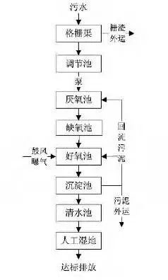 A2/O 工艺亦称A-A-O 工艺,本工艺为采用厌氧—缺氧—好氧法生物脱氮除磷工艺的简称,是流程最简单,应用最广泛的脱氮除磷工艺。适用于处理要求较高,四季气候变化大,气温较低的地区。