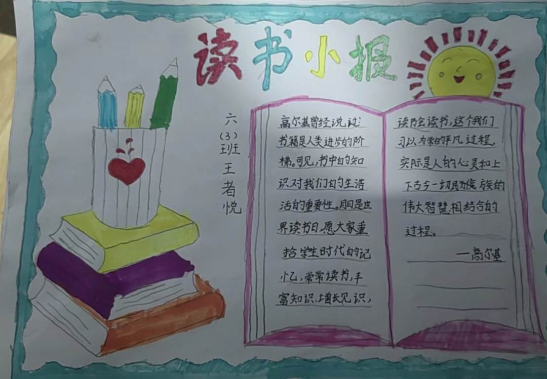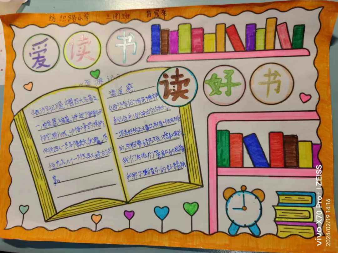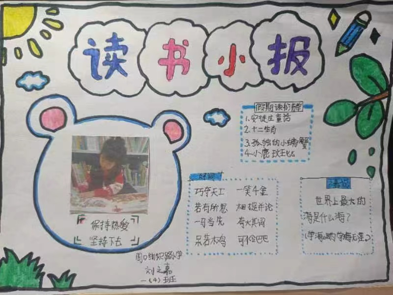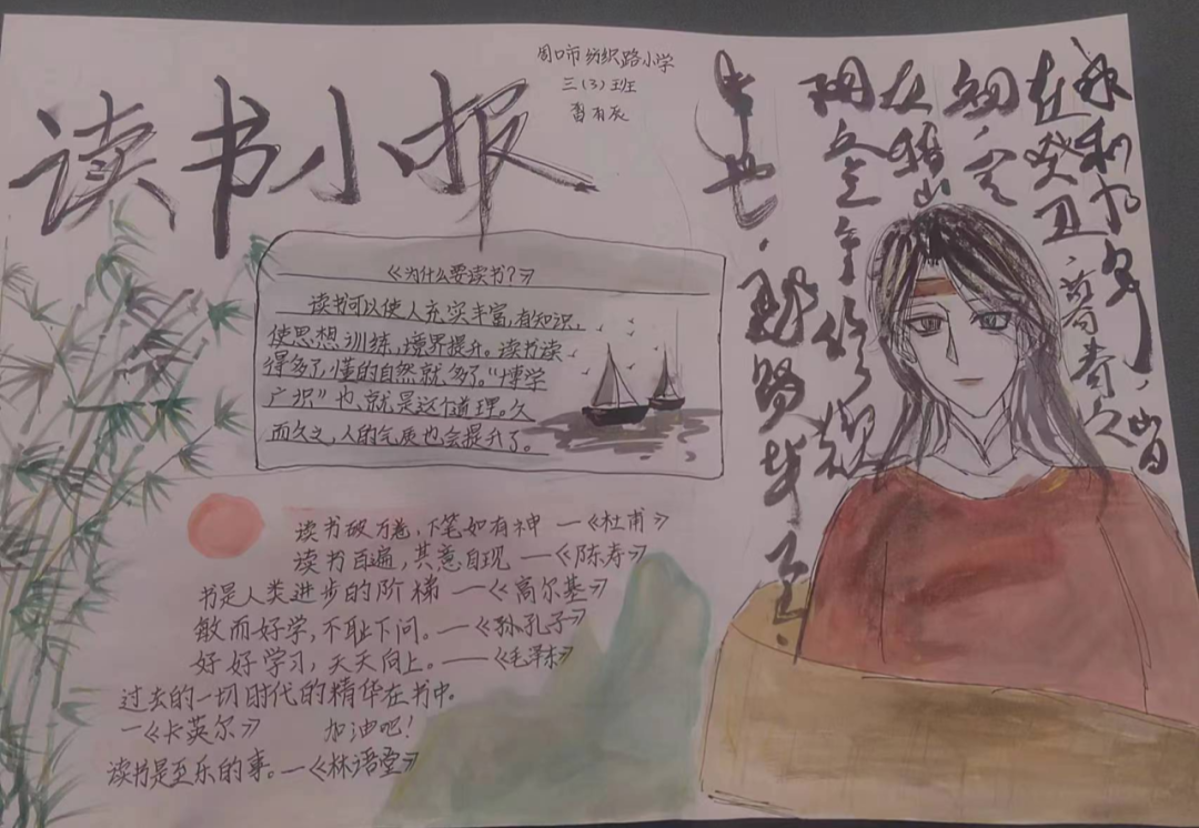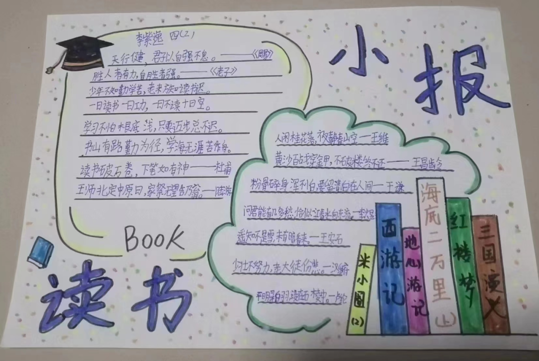读一本书,就是在同书中的人物对话。那一个个人物,一个个情节,或幽默或动人,早已在眼前鲜活地站了起来,给同学们留下了深刻的印象。图文并茂的阅读手抄报,涉及中外名著介绍、读书体会、读书故事、读书名言、思维导图、精美诗文选编等,充分反映了孩子们在读书活动中的所思所感所获。