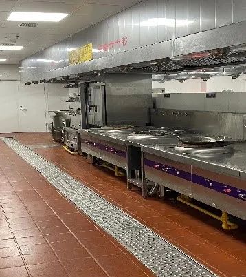 餐厅根据食品经营管理相关规范要求合理规划和设计,具备1000人/餐的供餐能力。后厨包含冷冻冷藏区、仓库、粗加工区、面点间、热厨区等功能区域,配套专业厨房设备,现烧现售,确保菜品新鲜可口;相应配备食品安全、消防环保设备设施,确保运营安全。