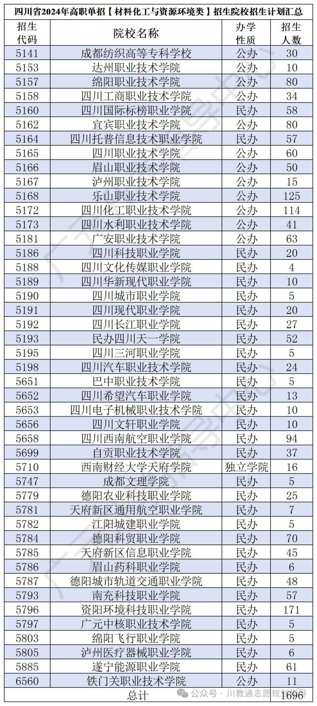 图1:2024四川单招【材料化工与资源环境类】院校招生计划汇总