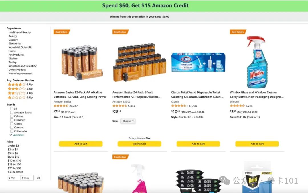 现在 amazon 上不少家居用品有消费满 $60 获得 $15 off 活动,电池、厨房用品、洗衣用品、洗手液等等。如果有囤货需求的话可以买一点