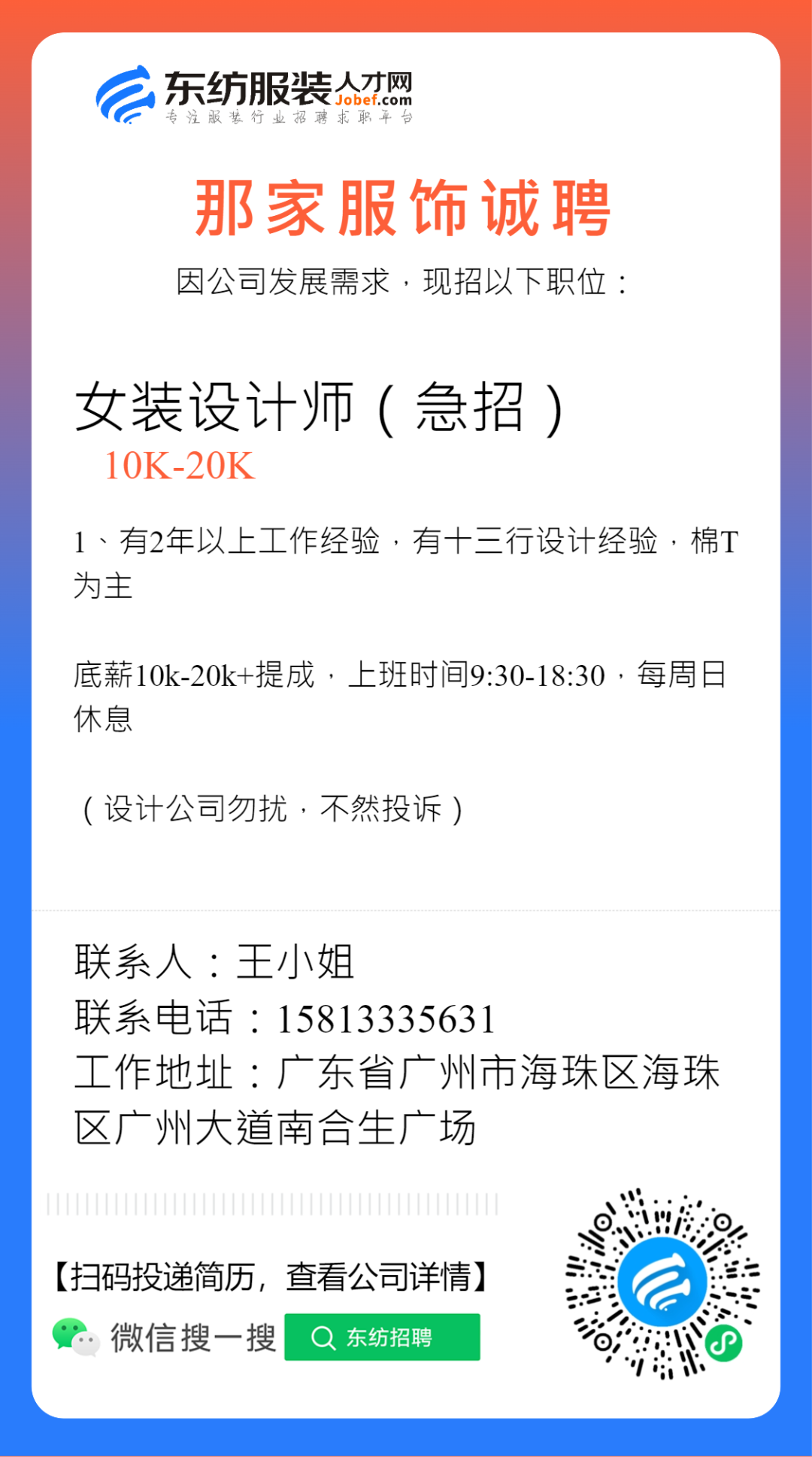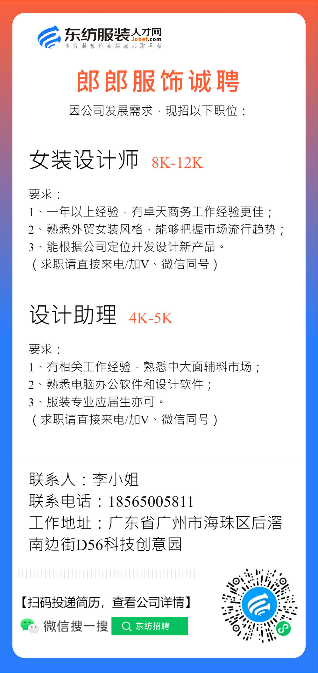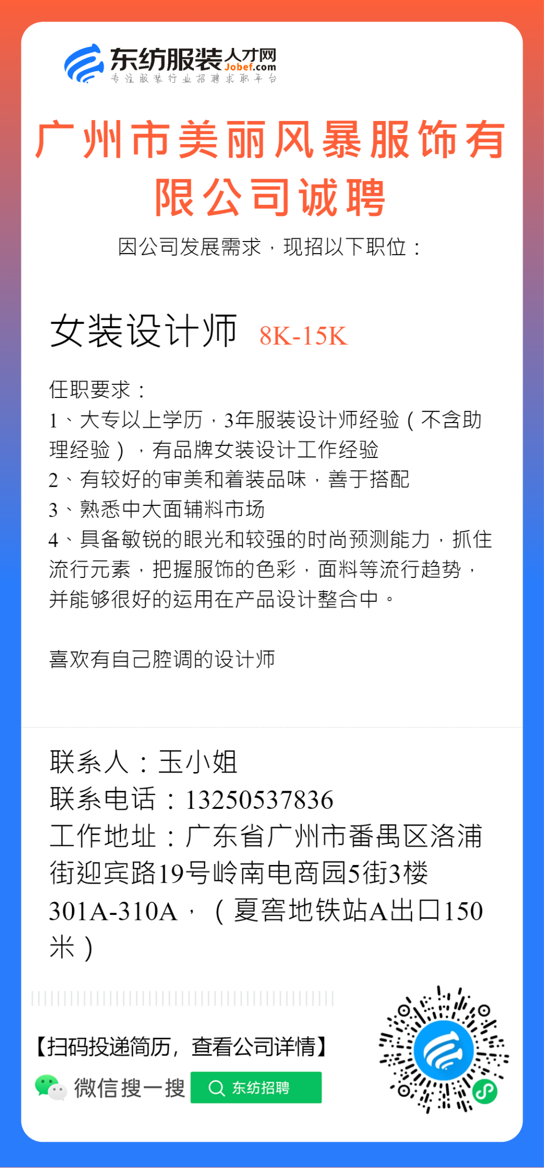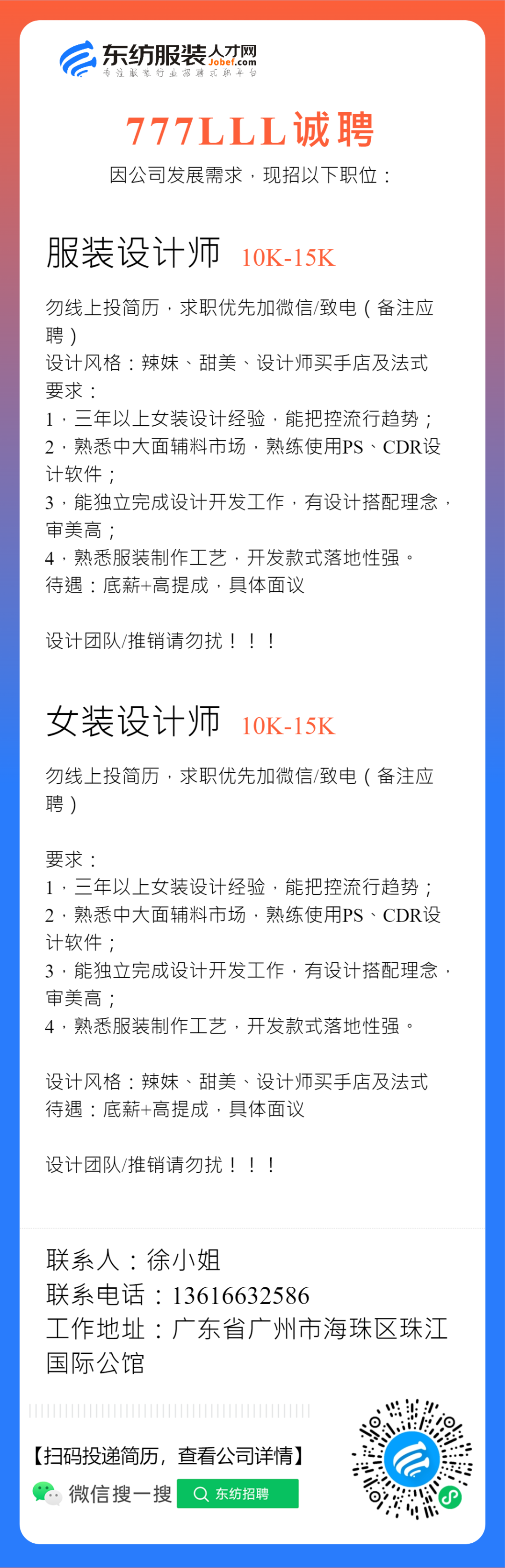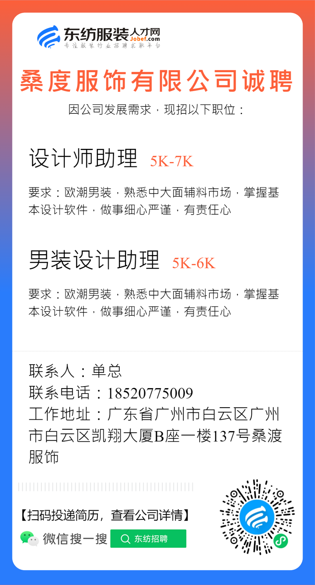 服装招聘·设计类丨2. 28号,女装设计师、男装设计师、童装设计师、设计助理.....