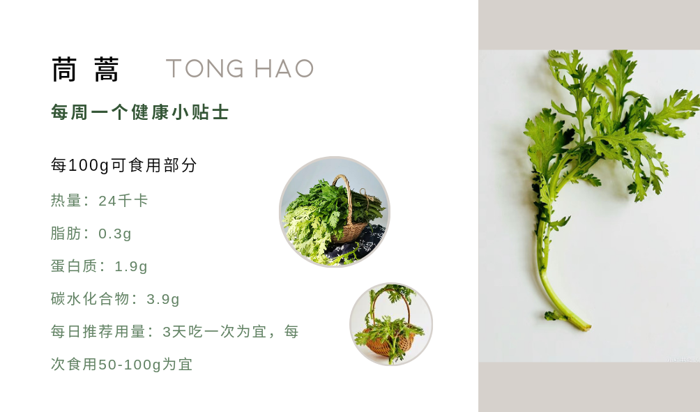 茼蒿原产地中海,营养丰富,清爽可口、气味芳香,含有维生素、胡萝卜素及多种氨基酸,可辅助改善脾胃不和,二便不利及咳嗽痰多等诸症。具有开胃消食、利肠通便、止咳化痰等功效。