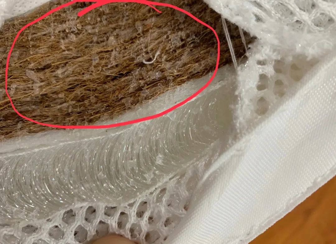 在这里给大家强调一下,廉价的棕榈床垫,一定要扒开看一看是否有胶水,如果有肉眼可见的胶水,赶紧扔掉!睡在这样的床垫上,不知道每天晚上要吸收多少甲醛!