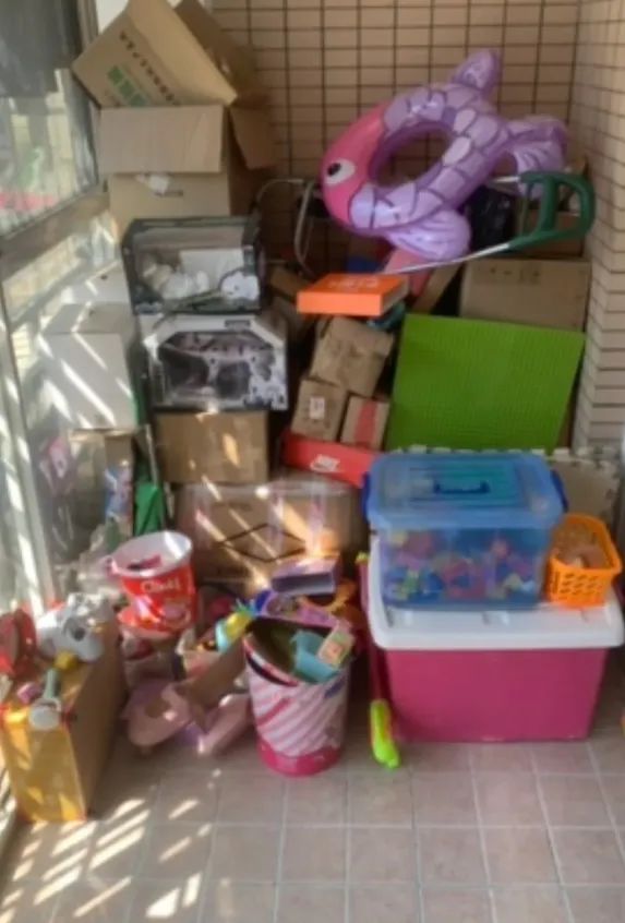 纸箱子、杂物箱、儿童玩具、垃圾桶、小推车……估计这位网友家里所有的杂物都在这里了。必须要承认的是,阳台的一角,的确是个好位置。但是也真诚建议大家不要这样操作。不仅影响整个阳台的美观,而且大大降低了阳台的空间。