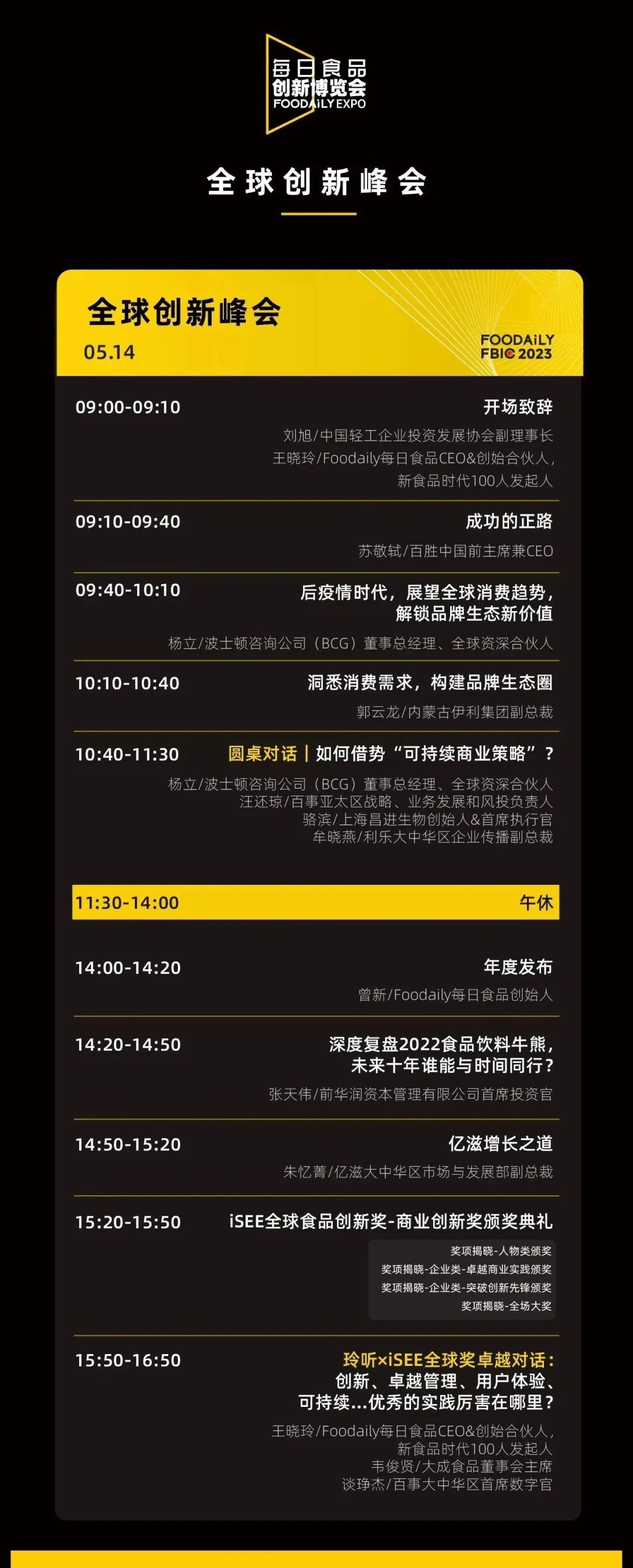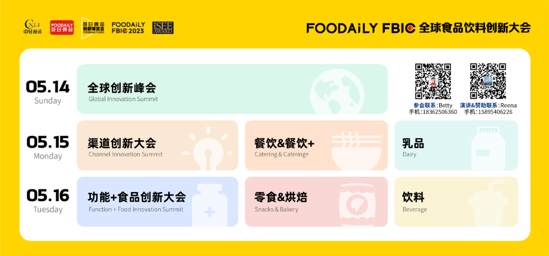 Foodaily创博会(第八届Foodaily FBIC全球食品饮料创新大会)将于5月14-16日在上海跨国采购会展中心举行。活动将围绕产品&品牌创新的从0到1、从B到C的全链路,通过会议、展览、奖项以及特别策划活动四大板块,360°立体呈现产品创新、品牌创新、行业创新以及新消费创新。