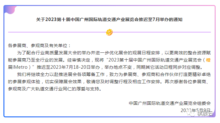 关于2023第十届中国广州国际轨道交通产业展览会推迟至7月举办的通知