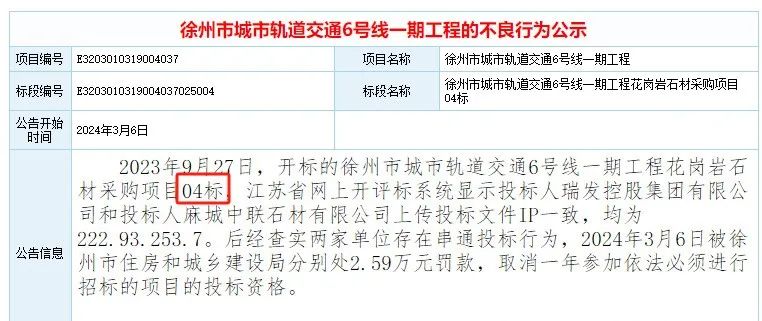 2023年9月27日,开标的徐州市城市轨道交通6号线一期工程花岗岩石材采购项目04标,江苏省网上开评标系统显示投标人瑞发控股集团有限公司和投标人麻城中联石材有限公司上传投标文件IP一致,均为222.93.253.7。后经查实两家单位存在串通投标行为,2024年3月6日被徐州市住房和城乡建设局分别处2.59万元罚款,取消一年参加依法必须进行招标的项目的投标资格。
