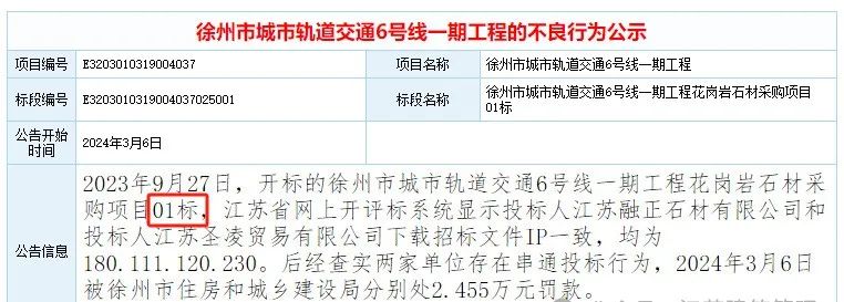 2023年9月27日,开标的徐州市城市轨道交通6号线一期工程花岗岩石材采购项目01标,江苏省网上开评标系统显示投标人江苏融正石材有限公司和投标人江苏圣凌贸易有限公司下载招标文件IP一致,均为180.111.120.230。后经查实两家单位存在串通投标行为,2024年3月6日被徐州市住房和城乡建设局分别处2.455万元罚款。