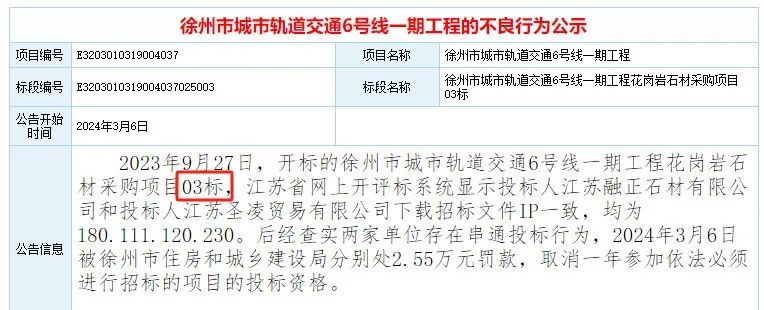 3月6日,江苏省建设工程招标网有8则串标处罚公示,涉及徐州市城市轨道交通6号线一期工程花岗岩石材采购项目4个标,4家单位两两串通投标被处罚,被查原因均为上传、下载招标文件IP一致。