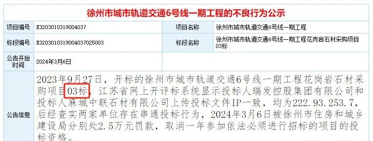 2023年9月27日,开标的徐州市城市轨道交通6号线一期工程花岗岩石材采购项目03标,江苏省网上开评标系统显示投标人瑞发控股集团有限公司和投标人麻城中联石材有限公司上传投标文件IP一致,均为222.93.253.7,后经查实两家单位存在串通投标行为,2024年3月6日被徐州市住房和城乡建设局分别处2.5万元罚款,取消一年参加依法必须进行招标的项目的投标资格。