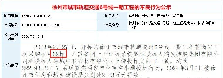 2023年9月27日,开标的徐州市城市轨道交通6号线一期工程花岗岩石材采购项目02标,江苏省网上开评标系统显示投标人瑞发控股集团有限公司和投标人麻城中联石材有限公司上传投标文件IP一致,均为222.93.253.7,后经查实两家单位存在串通投标行为,2024年3月6日被徐州市住房和城乡建设局分别处2.43万元罚款。
