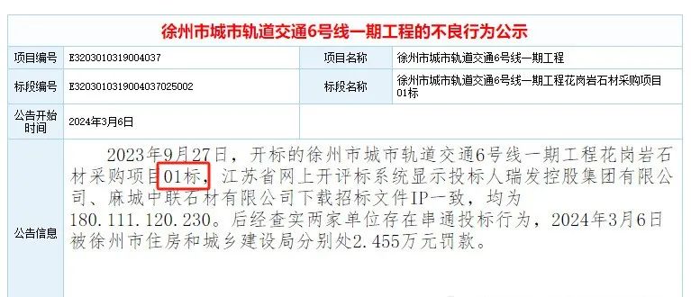 2023年9月27日,开标的徐州市城市轨道交通6号线一期工程花岗岩石材采购项目01标,江苏省网上开评标系统显示投标人瑞发控股集团有限公司、麻城中联石材有限公司下载招标文件IP一致,均为180.111.120.230。后经查实两家单位存在串通投标行为,2024年3月6日被徐州市住房和城乡建设局分别处2.455万元罚款。