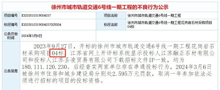 徐州轨交6号线采购项目01-04标,投标人江苏融正石材有限公司、江苏圣凌贸易有限公司串通投标,取消一年投标资格!