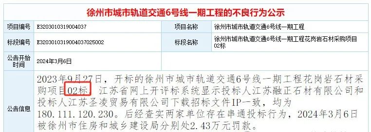2023年9月27日,开标的徐州市城市轨道交通6号线一期工程花岗岩石材采购项目02标,江苏省网上开评标系统显示投标人江苏融正石材有限公司和投标人江苏圣凌贸易有限公司下载招标文件IP一致,均为180.111.120.230。后经查实两家单位存在串通投标行为,2024年3月6日被徐州市住房和城乡建设局分别处2.43万元罚款。