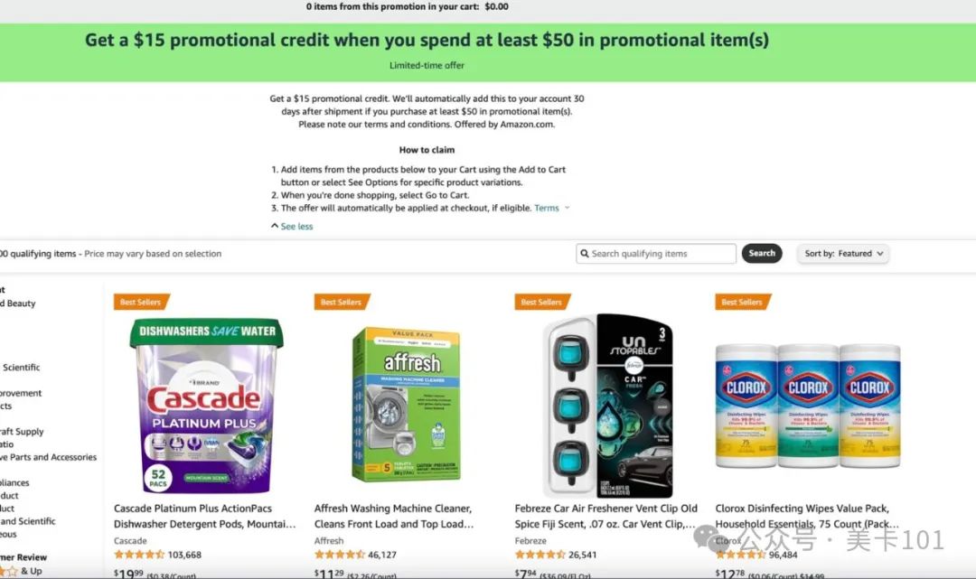 现在 amazon 上不少家居用品有消费满 $50 可以获取 $15 的 promotional credit 返还,厨房用品、洗衣用品、洗手液等等。如果有囤货需求的话可以买一点