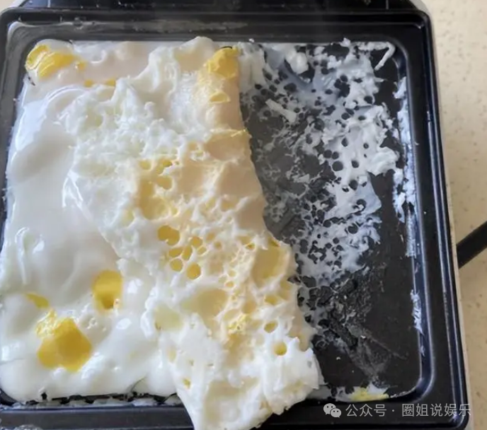 这台早餐机很小,一次最多只能煎一个鸡蛋。而且,锅边的设计过矮,即使尝试盖上盖子,鸡蛋还是会从旁边溢出,卫生状况堪忧。
