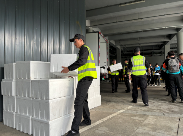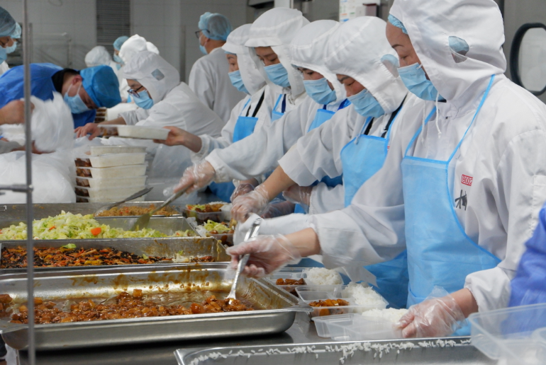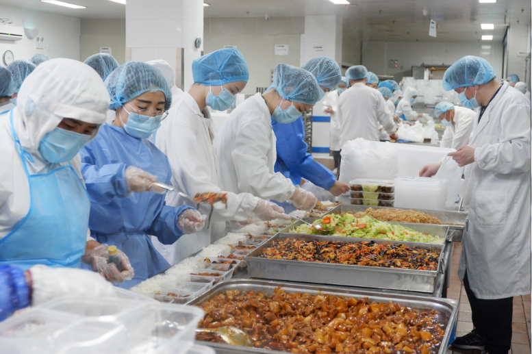 保障期间,汉莎航食公司提炼总结2023年亚运期间大型赛事供餐经验,成立生产突击队,充分发挥党员先锋作用,休息日全员到岗,扩充配餐队伍,组建5条生产流水线,高峰配餐可达1500份/小时。从原材料到成品装配,公司品控人员以航空配餐的高标准对全流程进行安全卫生把控。非航小组成员提前勘察场地,根据多个卸餐地点规划送餐路线,装车顺序,以确保快速、安全、高效的完成配餐工作。