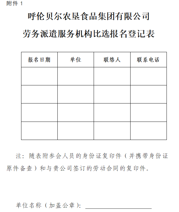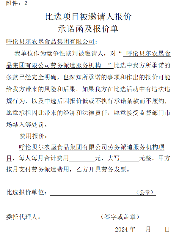 因食品集团及所属企业工作需要,针对部分临时性、辅助性和可替代性的岗位实行劳务派遣的用工形式。参照《呼伦贝尔农垦集团基本建设项目招标代理及限额以下第三方服务机构比选机构工作规则(试行)》规定,现拟采取比选方式确定一家具有资质的劳务派遣机构。现将比选有关事项公告如下:(一)项目名称:呼伦贝尔农垦食品集团有限公司劳务派遣服务机构比选项目(一)服务内容:按照有关法律、法规、规章等规定,参选单位负责招聘、派遣符合条件的劳务人员到用工单位工作。派遣人员必须满足用工单位提出的上岗条件且能够胜任用工单位所安排的工作。(二)服务期限:自2024年4月17日起至2025年4月16日止。(三)服务价格:最高限价劳务派遣服务管理费标准为每人每月80元。(一)在中华人民共和国境内注册,具有独立法人资格,有独立承担民事责任的能力。(二)具有相应的劳务派遣经营范围并具备劳务派遣经营许可证。(四)具有良好的企业信誉和具有健全的财务会计制度,有依法缴纳税收和社会保障资金的良好记录。(五)近3年内,比选申请人(法定代表人)在经营活动中没有重大违法记录,未被列入全国信用信息共享平台失信联合惩戒对象“黑名单”;法定代表人、经济或技术负责人没有因违反有关规定受到行政处分或刑事处罚。(一)营业执照。营业执照、开户行许可证(或基本存款账户信息)等复印件,复印件需加盖公章。(二)劳务派遣经营许可证。有效期内的《劳务派遣经营许可证》复印件,盖单位公章。(三)身份证明材料。比选单位法定代表人亲自参加的,提供法定代表人身份证复印件,如委托其他人参加的,需提供授权委托书(含法定代表人及受托人身份证复印件)。(四)出具相关承诺书及声明。出具对往年在经营活动中没有重大违法记录,未被列入全国信用信息共享平台失信联合惩戒对象“黑名单”的承诺书。(五)服务价格。比选申请人的报价以最高限价为基础,进行浮动报价,不得超过最高限价。报名地点:呼伦贝尔农垦食品集团有限公司(原合适佳公司)凡有意参与者,可将报名材料送至食品集团党群工作部或发送至指定邮箱529137854@qq.com。报名联系人:张文冰 联系电话:18204700582(一)从报名的符合条件单位中,由我公司发布邀请函。(二)比选单位持邀请函和相关材料于指定的时间和地点参加比选(邀请函需加盖公章)。(三)食品集团评审组经过比选评分后,评分最高的单位拟确定为中选单位。(四)签订劳务派遣协议。协议签订后,劳务派遣服务单位应积极履职,按照协议的要求,依法依规按照服务内容开展相应的工作,不得在服务过程中出现损害食品集团的行为及法律法规明令禁止的行为。如有违反上述要求的单位,一经发现立即将其列入公司“黑名单”。