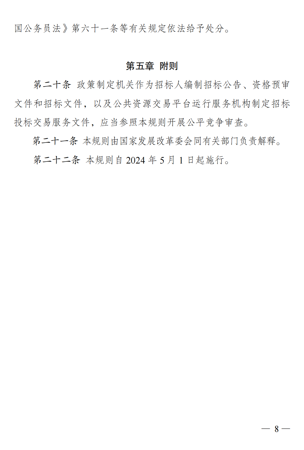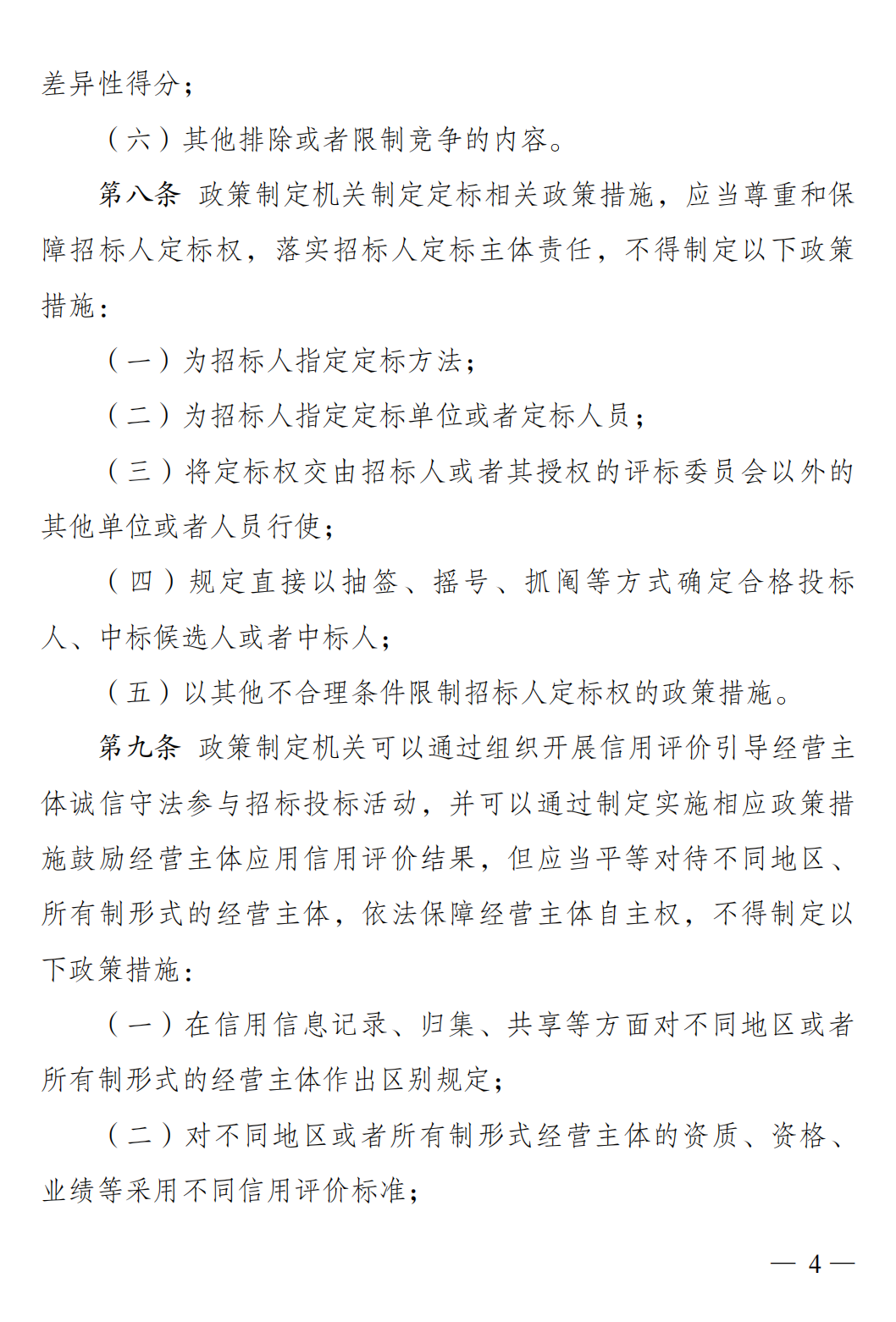 国家发改委等八部门印发的《招标投标领域公平竞争审查规则》当天对外公布,这是中国具体领域和行业性公平竞争审查的首部部门规章,将于5月1日起施行。近年来,中国大力清理招投标领域各类交易壁垒和不合理限制。但官方介绍,仍有一些相关政策措施设置歧视性信用评分,在定标时向本地企业和国有企业倾斜等。这些情况影响了经营主体公平参与招投标,民营企业和中小企业反映“投标难、中标难”问题较突出。为此,《规则》严把政策出台源头关口,明确提出招投标领域政策措施出台前应进行公平竞争审查;未经公平竞争审查或者经审查存在排除、限制竞争情形的,不得出台有关政策措施。针对实践中易发常见的不当干预招投标参与主体自主权、滥用信用评价排斥限制竞争、不当收取保证金等典型问题,《规则》提出七方面40余项具体审查标准,解决各种交易壁垒。