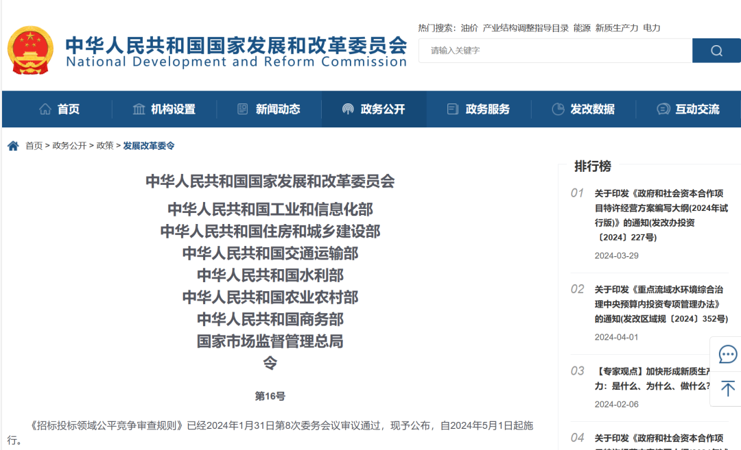 《招标投标领域公平竞争审查规则》已经2024年1月31日第8次委务会议审议通过,现予公布,自2024年5月1日起施行。
