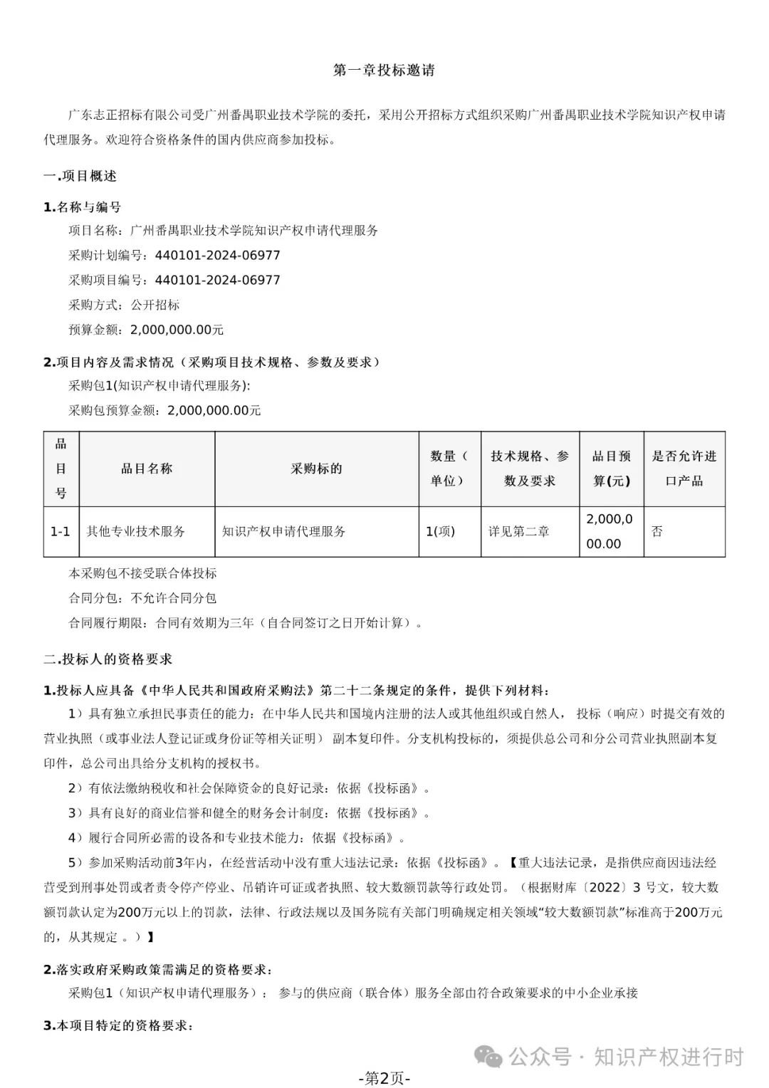 广州番禺职业技术学院知识产权申请代理服务招标项目的潜在投标人应在广东省政府采购网https://gdgpo.czt.gd.gov.cn/获取招标文件,并于 2024年04月29日14时30分 (北京时间)前递交投标文件。项目名称:广州番禺职业技术学院知识产权申请代理服务合同履行期限:合同有效期为三年(自合同签订之日开始计算)。二、申请人的资格要求: