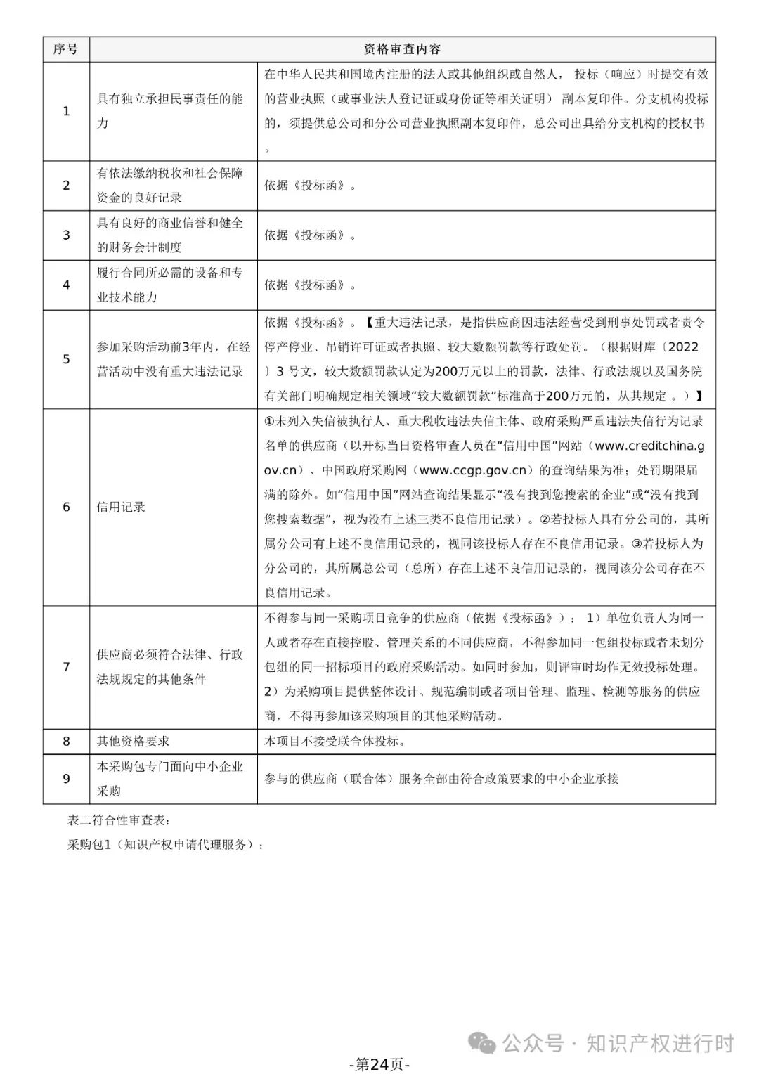 1.投标供应商应具备《中华人民共和国政府采购法》第二十二条规定的条件,提供下列材料:1)具有独立承担民事责任的能力:在中华人民共和国境内注册的法人或其他组织或自然人, 投标(响应)时提交有效的营业执照(或事业法人登记证或身份证等相关证明) 副本复印件。分支机构投标的,须提供总公司和分公司营业执照副本复印件,总公司出具给分支机构的授权书。2)有依法缴纳税收和社会保障资金的良好记录:依据《投标函》。3)具有良好的商业信誉和健全的财务会计制度:依据《投标函》。4)履行合同所必需的设备和专业技术能力:依据《投标函》。5)参加采购活动前3年内,在经营活动中没有重大违法记录:依据《投标函》。【重大违法记录,是指供应商因违法经营受到刑事处罚或者责令停产停业、吊销许可证或者执照、较大数额罚款等行政处罚。(根据财库〔2022〕3 号文,较大数额罚款认定为200万元以上的罚款,法律、行政法规以及国务院有关部门明确规定相关领域“较大数额罚款”标准高于200万元的,从其规定 。)】合同包1(知识产权申请代理服务)落实政府采购政策需满足的资格要求如下:参与的供应商(联合体)服务全部由符合政策要求的中小企业承接合同包1(知识产权申请代理服务)特定资格要求如下:(1)①未列入失信被执行人、重大税收违法失信主体、政府采购严重违法失信行为记录名单的供应商(以开标当日资格审查人员在“信用中国”网站(www.creditchina.gov.cn)、中国政府采购网(www.ccgp.gov.cn)的查询结果为准;处罚期限届满的除外。如“信用中国”网站查询结果显示“没有找到您搜索的企业”或“没有找到您搜索数据”,视为没有上述三类不良信用记录)。②若投标人具有分公司的,其所属分公司有上述不良信用记录的,视同该投标人存在不良信用记录。③若投标人为分公司的,其所属总公司(总所)存在上述不良信用记录的,视同该分公司存在不良信用记录。(2)不得参与同一采购项目竞争的供应商(依据《投标函》):1)单位负责人为同一人或者存在直接控股、管理关系的不同供应商,不得参加同一包组投标或者未划分包组的同一招标项目的政府采购活动。如同时参加,则评审时均作无效投标处理。2)为采购项目提供整体设计、规范编制或者项目管理、监理、检测等服务的供应商,不得再参加该采购项目的其他采购活动。三、获取招标文件