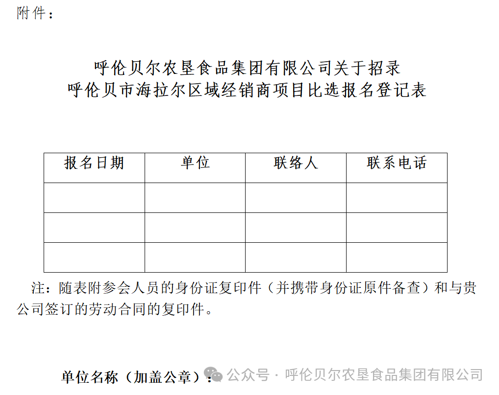 根据我单位海拉尔区域市场实际需求,我单位拟采取比选方式确定招录海拉尔区域夏日水经销商,现将比选有关事项公告如下:(一)服务名称:呼伦贝尔农垦食品集团有限公司招录呼伦贝尔市海拉尔区域夏日矿泉水经销商比选项目(四)服务内容:呼伦贝尔农垦夏日矿泉水销售、市场维护、客户开发、产品仓储及配送。1、海拉尔商超、社区店、餐饮及酒店、便利店的日常维护销售(业务覆盖不低于千家店)。2、海拉尔各企事业单位、政府单位用水维护,配合社区店及大型商超各档期活动策划执行。3、海拉尔区及周边村镇客户开发维护,包括(南屯、宝矿、哈克、陈旗、伊敏河镇)。(二)服务期限:合同有效期自比选结果公布起至2024年12月31日止。(一)在中华人民共和国境内注册,具有独立法人资格,有独立承担民事责任的能力,最低注册资本金200万元。(三)具有良好的企业信誉,具有健全的财务会计系统,有依法缴纳税收和社会保障资金的良好记录。(四)近三年内,比选申请人(法定代表人)在经营活动中没有重大违法记录,未被列入全国信用信息共享平台失信联合惩戒对象“黑名单”;法定代表人、高级管理人员没有因违反有关规定受到行政处分或刑事处罚。(五)具有1100㎡以上保温及常温仓库,拥有6辆及以上货车,以上两项需提供自有或租赁合同等其他证明材料。(六)拥有专业的售前、售后及管理团队(不少于30人)。(八)年度任务:截止2024年12月31日海拉尔区域整体共计任务额3000吨。(一)营业执照。公司营业执照、开户行许可证(或基本存款账户信息)、资质证书等复印件,复印件需加盖公章。(二)业绩证明材料。近三年(2021-2023年)业绩证明材料(复印件或扫描件);无业绩合同的可出具年度销售总额证明材料。(三)身份证明材料。比选单位法定代表人亲自参加的,提供法定代表人身份证复印件,如委托其他人参加的,需提供授权委托书(含法定代表人及受托人身份证复印件)。一是出具对往年在经营活动中没有重大违法记录,未被列入全国信用信息共享平台失信联合惩戒对象“黑名单”的承诺书;二是出具对法定代表人、经济或技术负责人没有因违反有关规定受到行政处分或刑事处罚方面的承诺书;三是在与我公司建立委托服务期间,因比选申请人原因,造成的一切损失,由比选申请人承担全部责任的声明。截止时间:2024年 4月14日 17:00 时。报名地点:呼伦贝尔农垦食品集团有限公司农垦营销中心(城投望园小区东南角)报名联系人:赵斌 ,联系电话:15704706333凡有意参与者,请将电子版报名材料发送至邮箱1766689334@qq.com (报名材料封面注明参与单位联系人及联系方式)(一)从报名的符合条件单位中,由我公司发布邀请函。(二)比选单位持邀请函、比选报名登记表(见附件)和相关材料于指定的时间和地点参加比选(邀请函需加盖公章)。如因不可抗力因素影响,比选单位不能参加现场比选评审会的,可以提交比选材料通过视频的形式进行评审。 (三)呼伦贝尔农垦食品集团有限公司评审组经过比选评分后,对符合要求的经销商纳入我公司经销商名册。 (四)签订经销商合同。合同签订后,中选单位应积极履职,按照合同的要求,依法依规按照项目内容开展相应的工作,不得在服务过程中出现损害呼伦贝尔农垦食品集团有限公司的行为及法律法规明令禁止的行为。如有违反上述要求的单位,一经发现立即将其列入公司“黑名单”。八、本次比选的最终解释权归呼伦贝尔农垦食品集团有限公司所有。