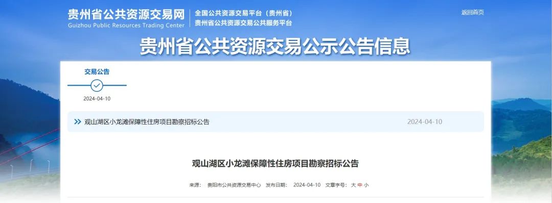 4月10日,贵阳市公共资源交易中心发布观山湖区小龙滩保障性住房项目勘察招标公告,招标人(项目业主)为贵阳观山湖黔龙盛合置业有限公司。根据公示:项目规划总用地面积为106111.58㎡,总建筑面积327490.71㎡,新建保障性住房1814套(一期1362套、二期452套)。建设内容包含主体工程、配套工程及土石方工程、教育配套运动场地、室外停车场、挡土墙及边坡支护、充电桩停车位、室外供电配电、大门及值班室、室外围墙、室外供排水工程、室外消防工程、室外燃气工程、室外弱电工程、道路工程、小区室外广场铺装硬化、绿化景观工程、室外路灯、环卫设施、污水处理、中水回用等。据了解,小龙滩保障性住房项目是观山湖区首个配售型保障性住房,位于贵州省贵阳市观山湖区站西路东侧,林城东路延伸段北面。项目距贵阳北站约2km,距国际生态会议中心约3km,交通便利,区位较好,周边基础配套设施相对完善。这一项目的启动不仅将改善贵阳市的住房条件,还将进一步推动观山湖区的城市化进程,为贵阳市的社会经济发展注入新的活力。*本预公告所列招标项目信息均为暂定,最终以实际招标时的信息为准。