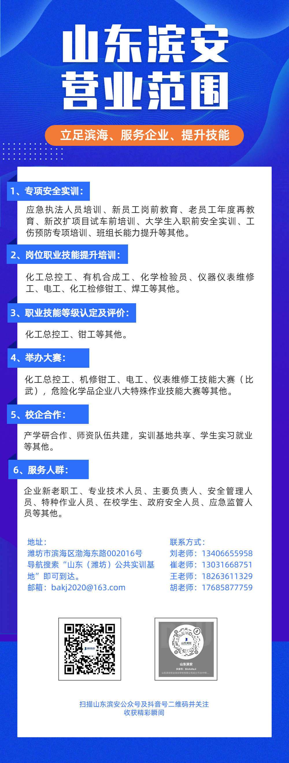 化工行业、工贸行业的安全管理人员、班组管理人员、检维修人员、监护人员等。山东(潍坊)公共实训基地G5化工实训楼(山东滨安培训学校有限公司),滨海区渤海东路002016号。扫描下方二维码,以企业为单位报名,培训费用每人200元/天,餐费每人15元/天(就餐可自理),各企业组织人于每批开班前两天完成报名。联系人:崔老师,咨询电话:13031668751(微信同号)王老师,咨询电话:18263611329(微信同号)四、培训内容