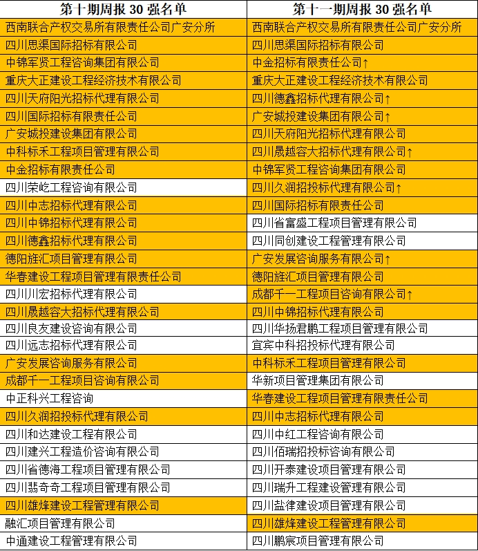 说明:“黄色”单元格为连续两周上榜成渝地区双城经济圈招标代理机构招标数据30强单位。