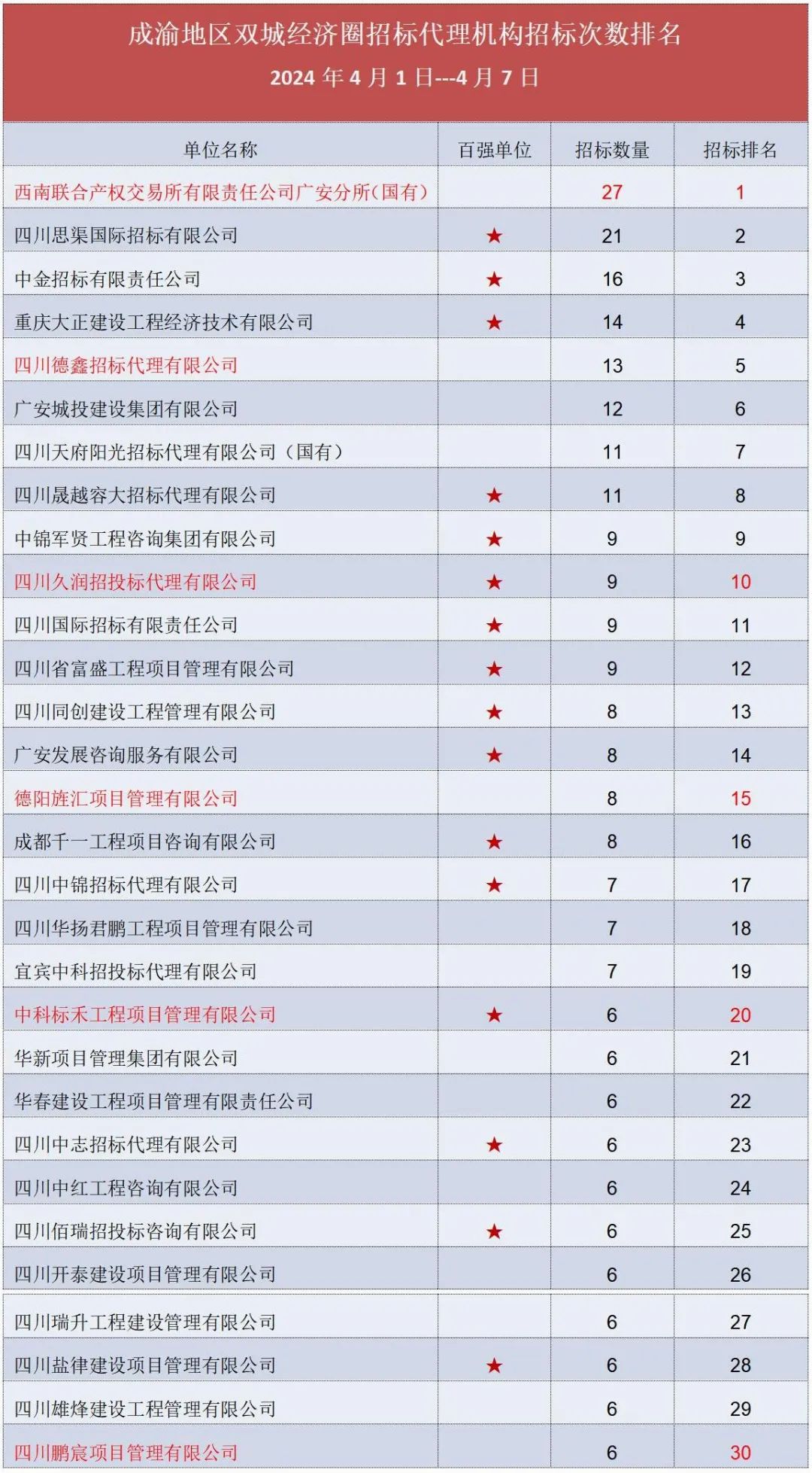 说明:★为2023年成渝地区双城经济圈招标代理机构综合实力百强单位,国有控股代理机构仅标注到周报前十名。