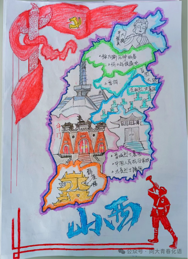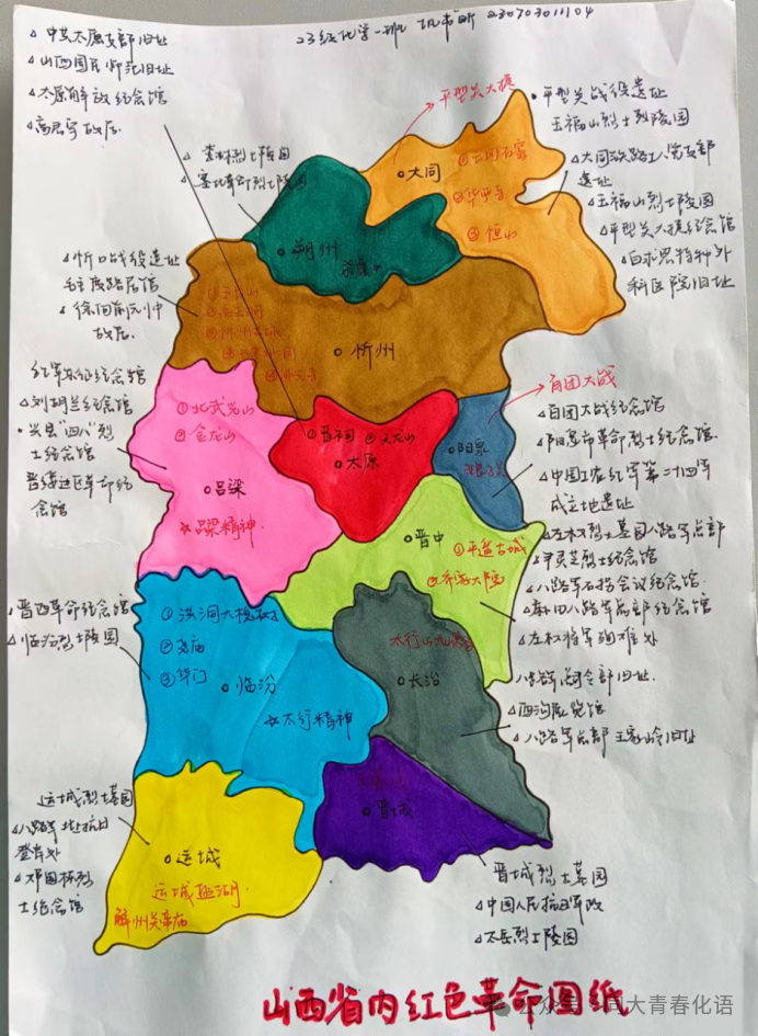 探寻革命先辈的红色足迹路线,传承红色基因,凝聚前行力量。我们脚下的每一寸热土,都是革命先辈们用热血和生命换来的。平型关大捷,百团大战等都发生在这里。通过画出山西省内红色革命路线来感受烽火岁月,将革命历史与精神以视觉形式呈现出来。