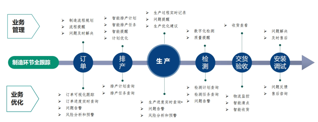 以用户采购订单和所属项目信息为主线,基于实物ID等跟踪产品制造全过程,做到订单执行轨迹的可视可分析、实时可查询,出现问题时及时解决并进行问题追溯。