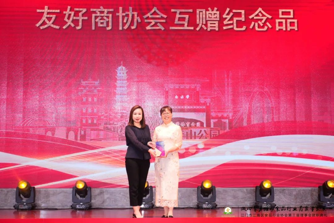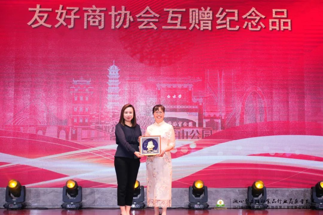 江海青商和江海区食品行业协会有多年深度的交流合作基础,对谢英珠当选第三届会长表示热烈祝贺,就职典礼上江海青商林碧芸会长与江海区食品行业协会谢英珠会长互赠纪念品。