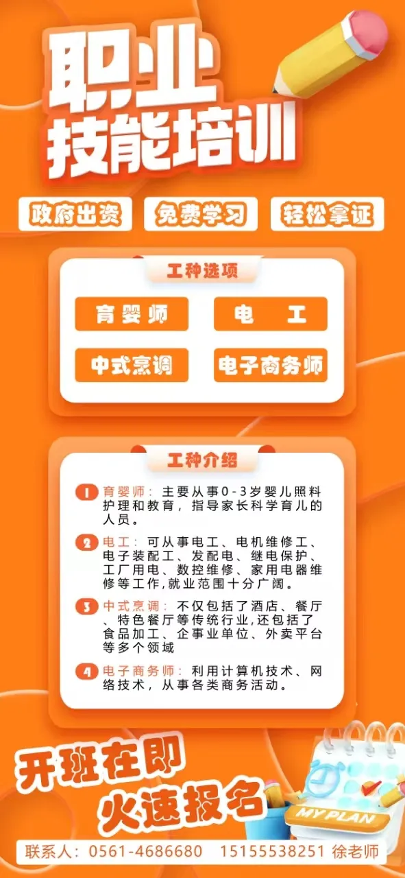 机会来了!育婴师,电子商务师,电工,中式烹调师开班在即,快来报名吧!