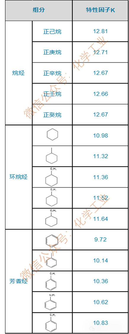 ——轻组分在60℉(15.6℃)时的相对密度; 特性因子(characterization factor)K:又称为Watson K值或UOP K值,表示石油馏分的烃类组成特性的一种指标,它是油品的平均沸点和相对密度的函数。