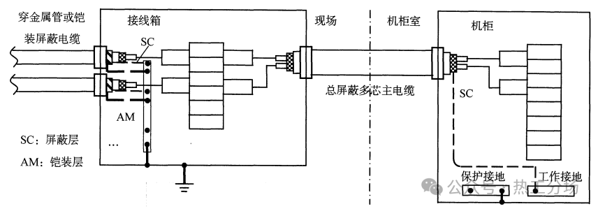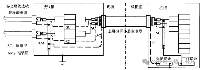 图 A-1 总屏分屏多芯主电缆屏蔽层连续在机柜室接地图