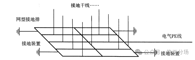 2.5 网型结构的室内接地网应采用至少 4 条的接地干线经不同路径、不同方向的连接方式接到室外接地装置。