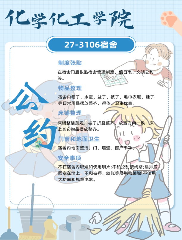 为贯彻落实学校本科教育教学审核评估学生工作动员部署会议和《大学生文明素质养成专项工作方案》精神,进一步推动“一站式”社区服务,营造文明、和谐、积极向上的宿舍氛围,2024年4月9日以来,化学化工学院持续开展“馨舍风范”文明宿舍创建专项行动。