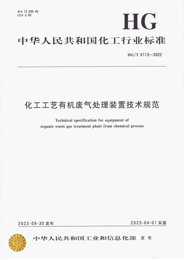 国家工业和信息化部公告(2022年第23号)正式批准《化工工艺有机废气处理装置技术规范》(HG/T 6113—2022)化工行业标准,本标准由全国废弃化学品处置标准化技术委员会归口。标准于2022年9月30日发布,2023年4月1日正式实施。