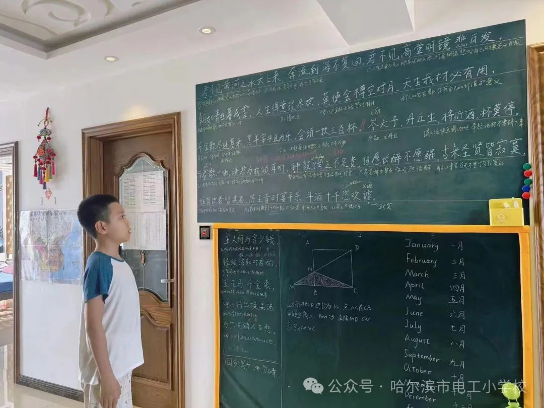 3、利用碎片时间。饭前或饭后的十几分钟时间,我会让孩子读一读黑板上的古文、单词、或者做两道数学题。短短的时间对于他来说没有压力,但可以做到日积月累,积少成多。